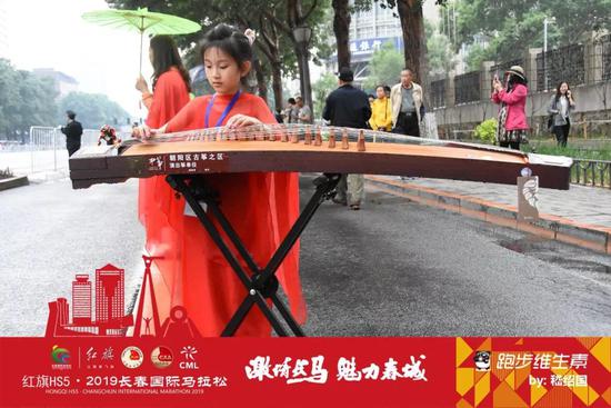 比如,赛事按部就班。比如赛道6—7K经过了“网红喷水大桥”——长春南湖大桥。下着大雨,南湖大桥还照常喷水,看着直乐。湖面上还有十几只蓝色帆船,不知道是否为了比赛刻意安排的。如果天晴的话,这个地方蛮有诗意的。还有,有两三处喷淋站,明明在下雨,但照喷不误。有微博网友说,下雨还让学生表演古筝(一说是古琴)。但我跑到的时候,路边空剩一台古筝在淋雨。